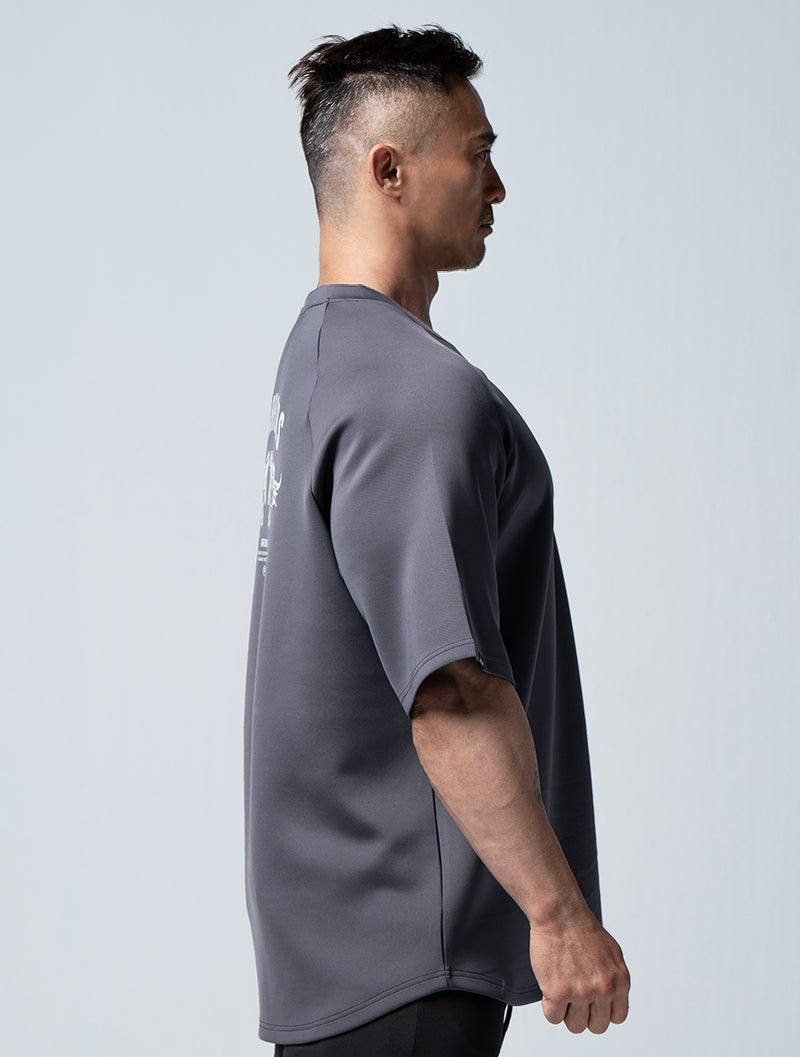 オーバーサイズの身幅はゆったりと快適な着心地を実現し、わずかに落ちたショルダーラインのデザインが肩まわりを強調。肩幅を広く見せ、よりたくましい印象とスタイルアップ効果を演出します。